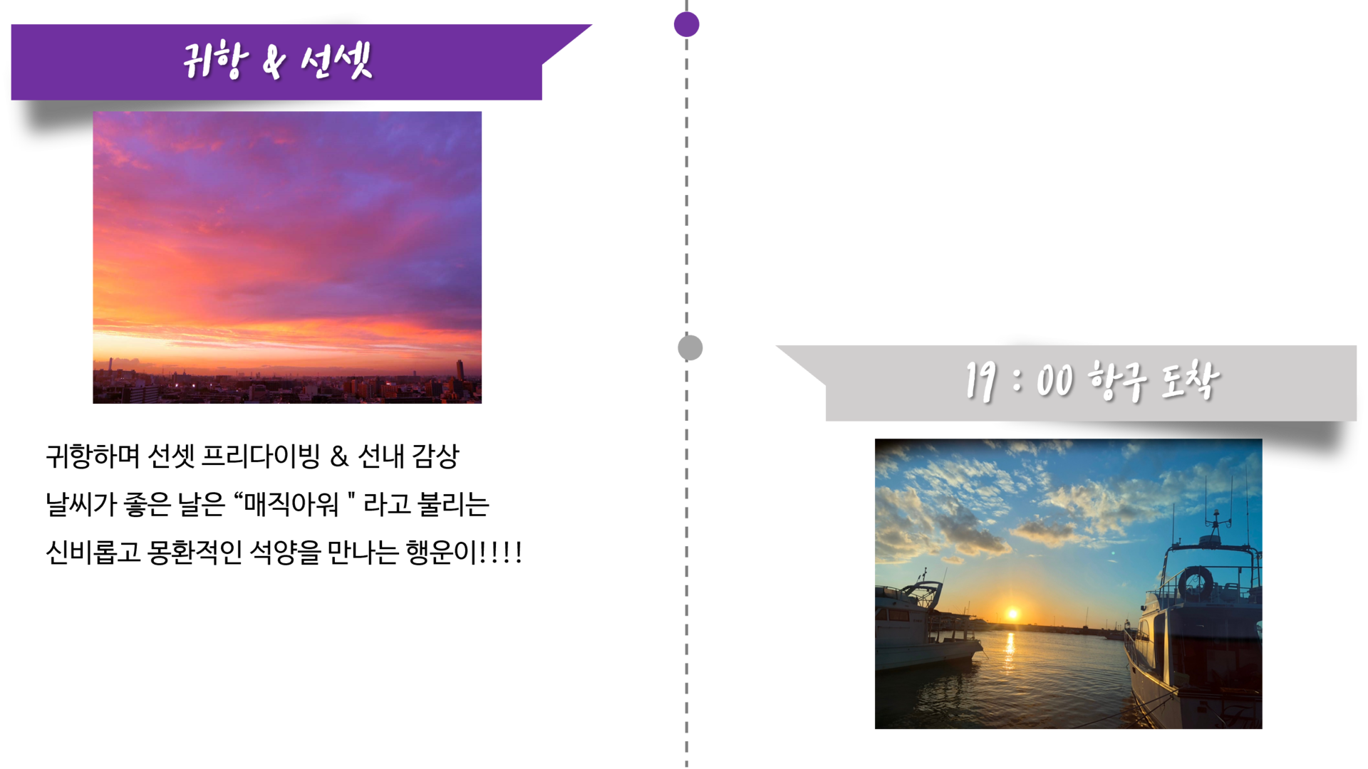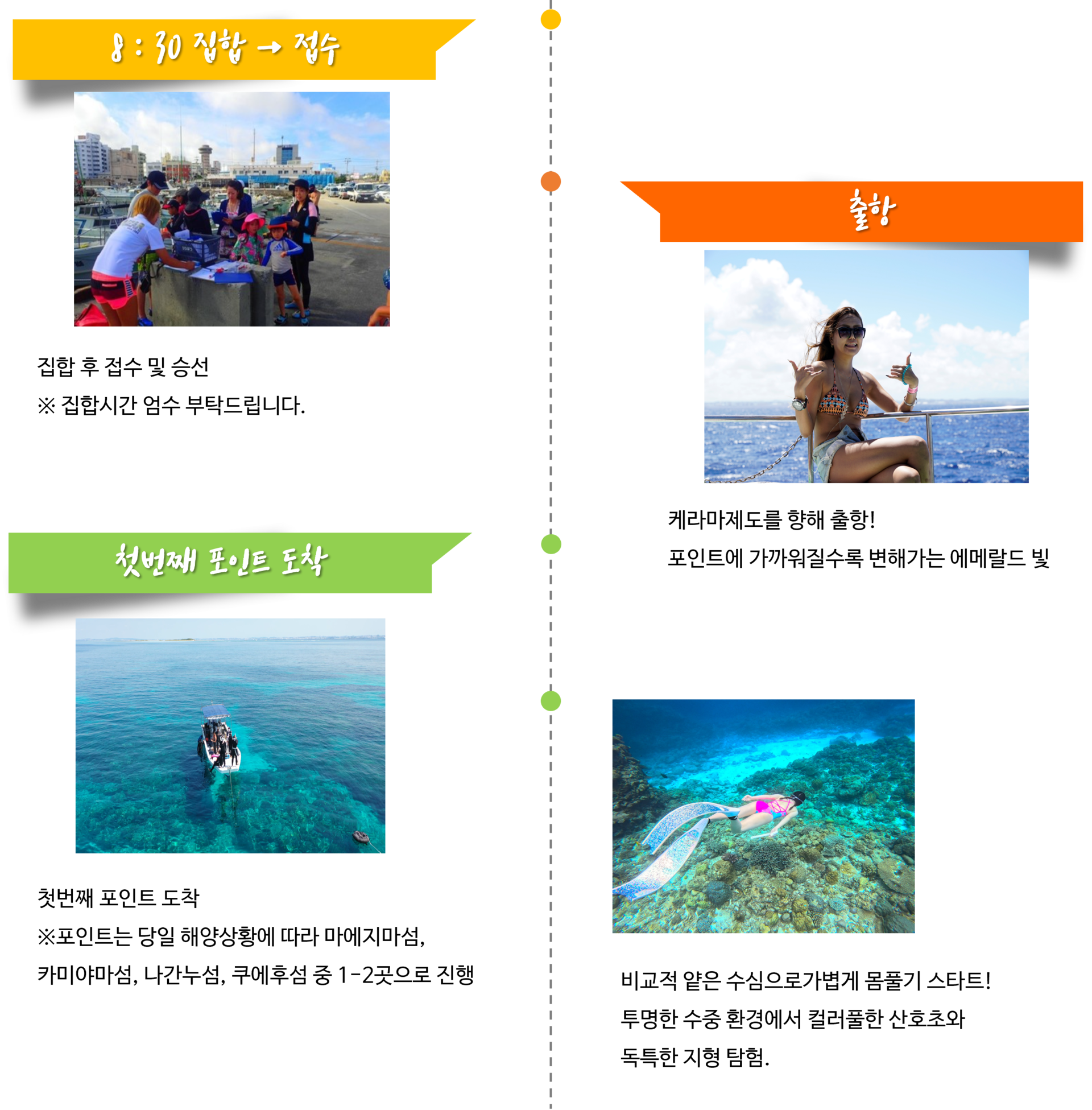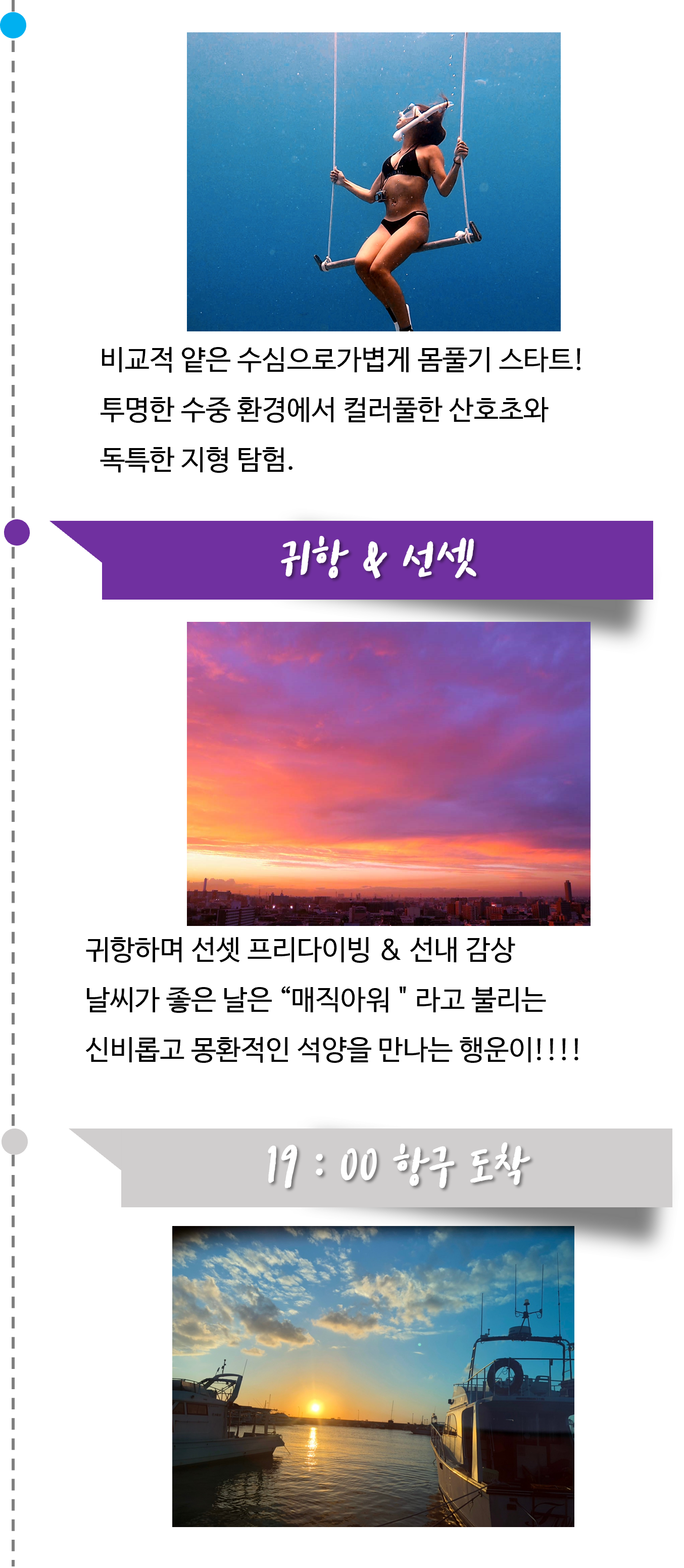 ▶ 투어 스케줄은 당일 해양 상태에 따라 30분~1시간정도 차이가 있을 수 있습니다.