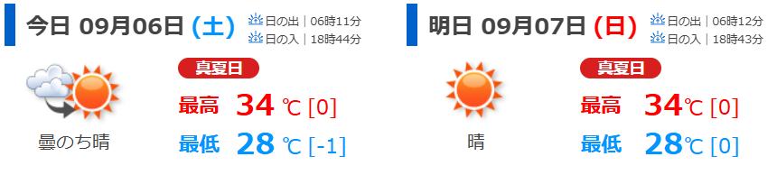 기온: 아침 31 °C → 한낮 34 °C (체감 더 높음)